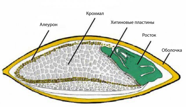 - Оболонка (отруби) - содержит клетчатку, ненасыщенные жирные кислоты и минеральные вещества (фосфор, калий, марганец, железо, кальций, магний).