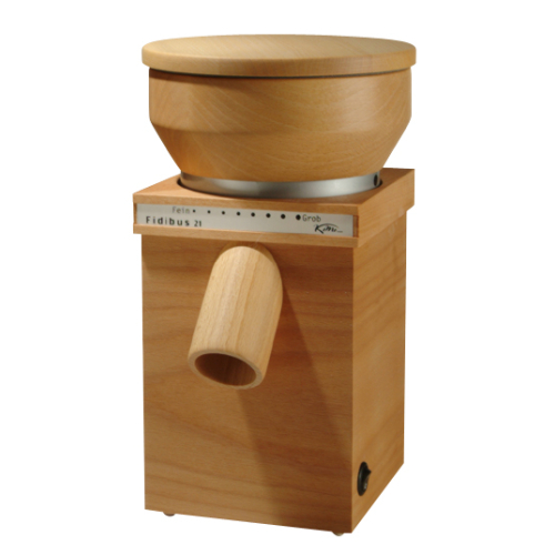 Модель Fidibus 21 на протяжении долгого времени остаётся одной из наиболее востребованных мельниц. В добротном буковом корпусе помещается надёжная и современная техника для помола. Благодаря промышленному двигателю 250 Ватт и самозатачивающимся жерновам из корундовой керамики диаметром 75 мм мельница Fidibus 21 способна перемолоть любые виды зерновых (кроме кукурузы) со скоростью 100 г муки тонкого помола в минуту.