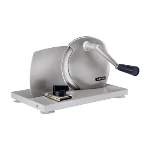 Светло-серая лакированная ломтерезка из легкого металла с покрытым основанием и нержавеющим ножом диаметром 170 мм. Имеет 4 ножки с присосками для установки на любом гладком покрытии.