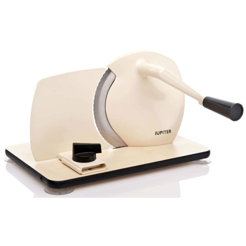 Бежевая лакированная ломтерезка из легкого металла. Красивая, ударопрочная, водостойкая, с нецарапающейся поверностью покрытой пластиком высокого давления особенно легка в уходе. Нож из нержавеющей стали диаметром 170 мм.