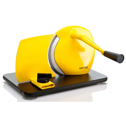 Желтая лакированная ломтерезка из легкого металла. Красивая, ударопрочная, водостойкая, с нецарапающейся поверностью покрытой пластиком высокого давления особенно легка в уходе. Нож из нержавеющей стали диаметром 170 мм.