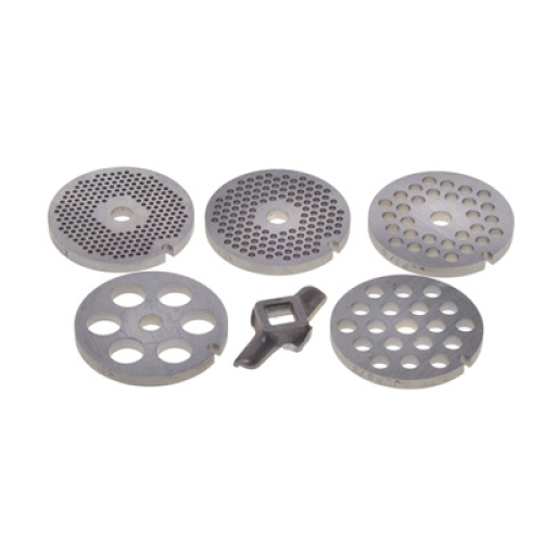 Незаменимые принадлежности. Пять перфорированных дисков с отверстиями диаметром 2, 3, 6, 8 и 14 мм, а также2х-лопастной нож из высококачественной нержавеющей стали.