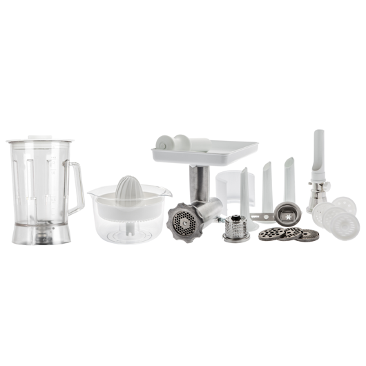 8 насадок (включая блендер, соковыжималку и мясорубку) позволят перемалывать мясо, молоть орехи, тереть сыр, готовить пасту, выжимать соки и взбивать коктейли, превращая комбайн в универсальную кухонную машину.
